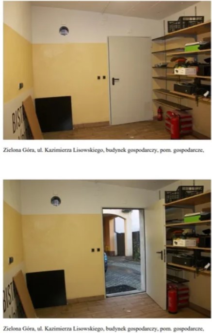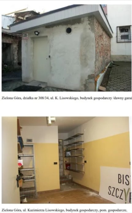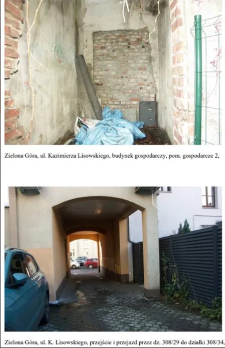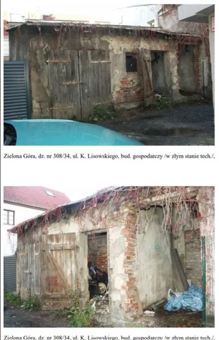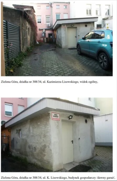 nieruchomość gruntową zabudowaną położoną w Zielonej Górze przy ul. Kazimierza Lisowskiego gmina i powiat miasto Zielona Góra województwo Lubuskie, dla której Sąd Rejonowy w Zielonej Górze prowadzi księgę wieczystą KW ZG1E/00129852/3 w skład której wchodzi prawo użytkowania wieczystego gruntu oznaczonego w ewidencji gruntów jako działka nr 308/34 o powierzchni 0,0104 ha oraz prawo własności budynków stanowiących odrębną nieruchomość wchodzące w skład masy upadłości GIOCO spółka jawna M. Graczyk, N. Bylebył. Użytkownikiem wieczystym gruntu do dnia 12.04.2098 roku i właścicielem budynków stanowiących odrębną własność jest GIOCO spółka jawna M. Graczyk, N. Bylebył z siedzibą w Zielonej Górze. Właścicielem gruntu oznaczonego ewidencyjnie jako działka 308/34 o powierzchni 0,0104 ha jest Gmina Zielona Góra o statusie miejskim. Działka 308/34 zabudowana jest dwoma budynkami o funkcji gospodarczej.